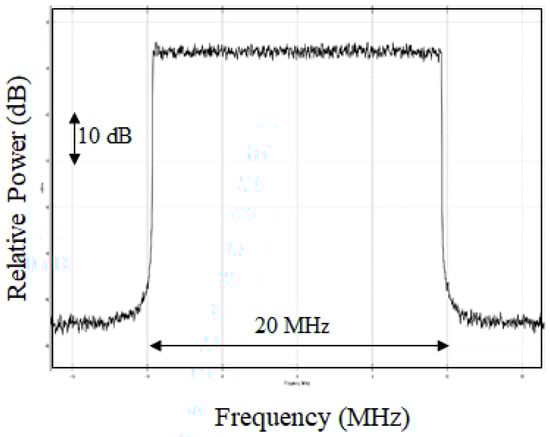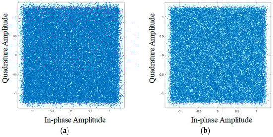 Figure 5a,b shows the signal constellation for 1024- and 4096-QAM, respectively, at the transmitter side. As the multilevel (order) of QAM increases, the Euclidean distance among signal constellations naturally shortens, as shown in Figure 5. Figure 6 shows the observed instantaneous OFDM spectrum for 1200 subcarriers containing 1024- or 4096-QAM symbol modulation signals.