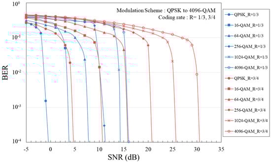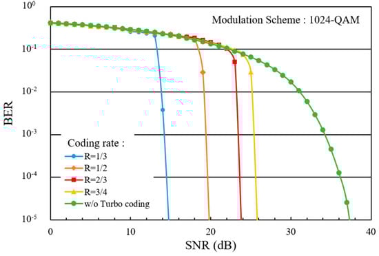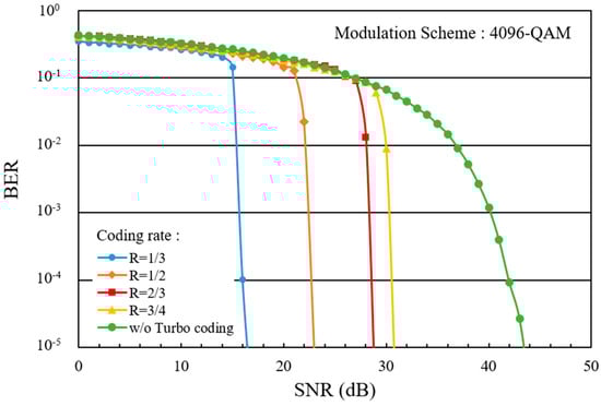 Figure 7 plots the fundamental BER against received SNR of 1024-QAM at various coding rates, R, under an AWGN channel condition. The BER is measured by comparing the demodulated serial bits with the original binary serial bits. In this work, we assume a benchmark BER of 1 × 10−2. When turbo coding and soft-decision Viterbi decoding are used, the SNRs needed to achieve a BER of 1 × 10−2 at coding rates R of 1/3, 1/2, 2/3, and 3/4, which are approximately 14 dB, 19 dB, 23 dB, and 25 dB, respectively. The BER at a coding rate of one, i.e., without coding (w/o), is also plotted as a reference. Figure 8 plots the fundamental BER against received SNR of 4096-QAM at various coding rates under the condition of AWGN channels. The SNRs needed to achieve a BER of 1 × 10−2 at coding rates of 1/3, 1/2, 2/3, and 3/4 are approximately 16 dB, 22 dB, 28 dB, and 30 dB, respectively. Relative to 1024-QAM, the SNRs needed to achieve the benchmark BER of 1 × 10−2 for 4096-QAM are increased by approximately 2 dB, 3 dB, 5 dB, and 5 dB at coding rates of 1/3, 1/2, 2/3, and 3/4, respectively. Figure 9 shows an overall comparison of BERs for QPSK, 16-, 64-, 256-, 1024-, and 4096-QAM at coding rates of 1/3 (blue lines) and 3/4 (red lines). The SNRs required for 4096-QAM at these coding rates are, respectively, 17 dB and 26 dB higher than those required for QPSK. Current LTE mobile systems use a link adaptation technology that can choose a modulation scheme and coding rates depending on the channel quality, i.e., received SNR or SINR. The results in Figure 9 suggest that if 4096-QAM is used for the “modulation and coding sets (MCS)”, 4096-QAM at coding rates of 1/3 or 3/4 can be assigned to a UE at received SINRs of more than 16 dB or 30 dB, respectively. Similarly, 1024-QAM at a coding rate of 1/3 can be assigned to a UE at received SINR of more than 14 dB.