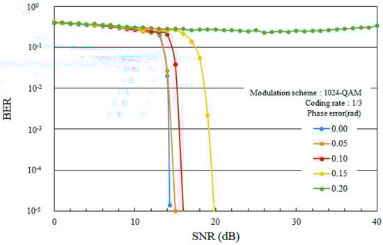 BER performance of 1024-QAM as a function of phase error at a coding rate of 1/3 [26].