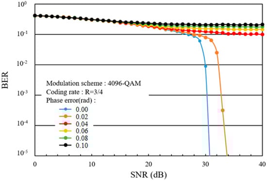 BER performance of 4096-QAM as a function of phase error at a coding rate of 1/3 [26].