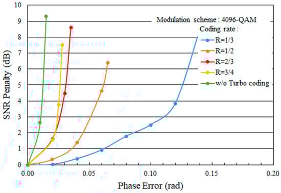Figure 12 shows the SNR penalty needed to achieve a BER of 1 × 10−2 against phase error for 1024-QAM at various coding rates. It is clearly observed that the SNR penalty increases as the phase error increases. The SNR penalty is approximately 6 dB at a phase error of 0.05 and a coding rate of 3/4. To reduce the SNR penalty to below 3 dB, the phase error cannot exceed 0.04 at coding rates of 3/4 or below.