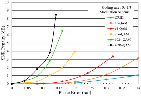 Figure 16 plots the SNR penalty required to achieve a BER of 1 × 10−2 against phase error for QPSK, 16-, 64-, 256-, 1024-, and 4096-QAM at a coding rate of 1/3. Phase error severely impacts 1024- and 4096-QAM compared with existing QAM and QPSK schemes. To limit the SNR penalty to below 3 dB, the phase errors for 16-, 64-, 256-, 1024-, and 4096-QAM must be no greater than 0.39, 0.31, 0.18, 0.12, and 0.11, respectively.