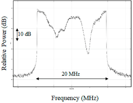 Next, we evaluate the BER performance of 1024- and 4096-QAM in the multipath fading channels listed in Table 2. Figure 17a,b show the signal constellations for 1024- and 4096-QAM, respectively, observed at a receiver side affected by EPA fading. Figure 18 shows the instantaneous OFDM spectrum observed at the receiver side. Channel estimation and channel equalization, as shown in Figure 2, play an important role to compensate these distorted signals at the receiver side. If the channel estimation and channel equalization do not work sufficiently, the BER performance worsens.