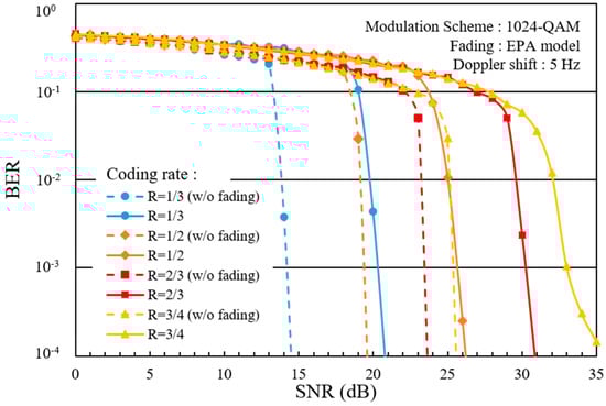 Figure 21 plots the BER of 4096-QAM against received SNR under EPA fading at coding rates of 1/3, 1/2, 2/3, and 3/4. At a coding rate of 1/3, the SNR required to achieve a BER of 1 × 10−2 is approximately 22 dB, which is approximately 7 dB higher than that is required under the static condition. This behavior is similar to that observed at the other coding rates. Relative to 1024-QAM, the SNRs required to achieve a BER of 1 × 10−2 at coding rates of 1/3, 1/2, 2/3, and 3/4 under EPA fading are increased by approximately 2–5 dB.