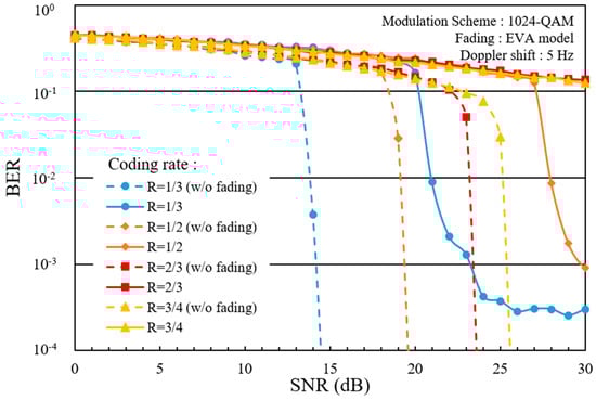 Figure 20 plots the BER of 1024-QAM against received SNR under the EVA fading model. Compared to the EPA fading case, the BER performance is significantly degraded. At a coding rate of 1/3, the SNR required to achieve a BER of 1 × 10−2 is approximately 22 dB, which is approximately 8 dB higher than that is required under the static condition. At coding rates above 2/3, 1024-QAM can no longer achieve a BER of 1 × 10−2.