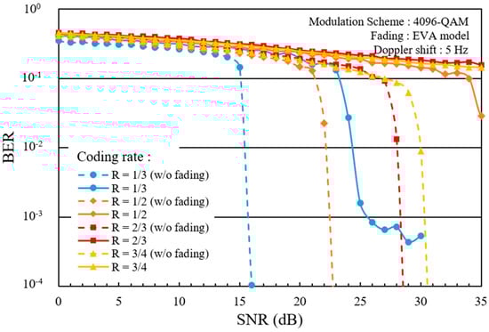 Figure 22 plots the BER of 4096-QAM against received SNR under EVA fading. At a coding rate of 1/3, the SNR required to achieve a BER of 1 × 10−2 is approximately 24 dB, which is approximately 9 dB higher than that is required under the static condition. At coding rates greater than 1/2, 4096-QAM can no longer achieve a BER of 1 × 10−2.