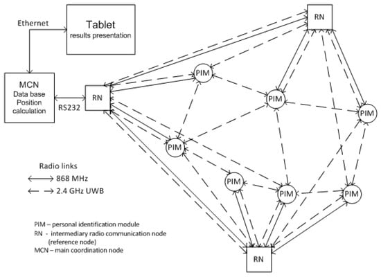 The Automatic Person Localization System (SALOn) was developed at the Department of Radio Communication Systems and Networks of Gdansk University of Technology. It was constructed to support the actions of uniformed services (police officers and firefighters) in unknown buildings by monitoring the movement of people equipped with Personal Identification Modules (PIMs) inside such buildings. Those modules realize radio distance measurements to intermediary radio communication nodes, which also act as reference nodes (RN). Those measurements are made with the utilization of ultra-wideband (UWB) technology and Nanotron NA5R1 devices, which use the SDS-TWR measurement method. Those devices emit chirp signals in the band of 80 MHz on a frequency of 2.4 GHz. That signal may be considered as UWB according to reference [30]. The scheme of the SALOn system is depicted in Figure 3.
