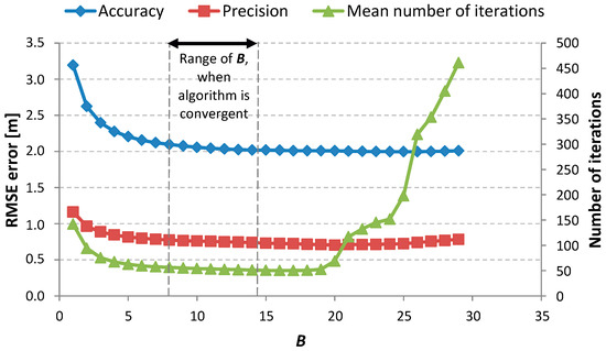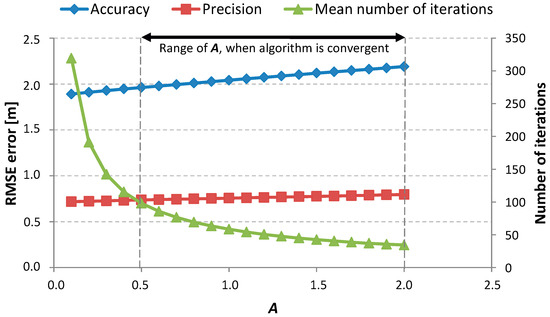 The convergence and stability of the algorithm were checked by observing the coefficient correction values and . If they were less than , it meant that the solution was found and that the algorithm was convergent and stable. This threshold value was chosen heuristically. The general character of changes in accuracy, precision, and mean number of iterations due to changes of parameters and was similar for all the analyzed environments. Consequently, the calibration process was described for only one selected environment in this article.