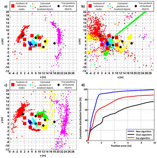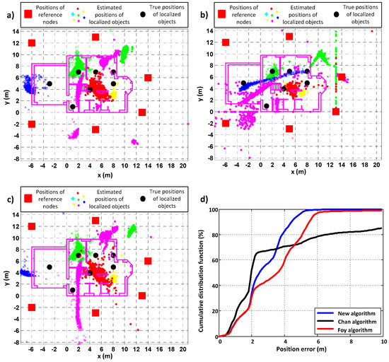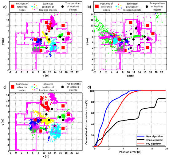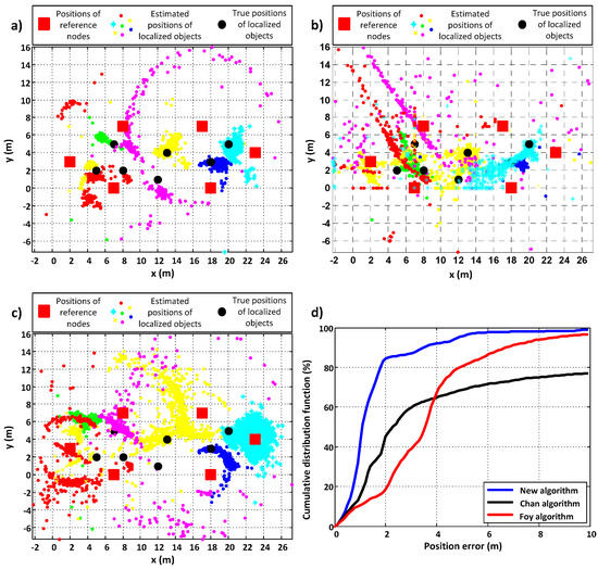 In this scenario, as well, the proposed algorithm gives the best results—the values of errors are the lowest (almost 5 times better than the Foy algorithm and almost 6 times better than the Chan algorithm) and positions were calculated for all sets of distance measurements, while the loss probabilities for the Chan and Foy algorithms were greater than zero. In Figure 8a–c, it can be seen that the concentration of estimated positions around the true positions of PIMs is the greatest for the new algorithm. This is confirmed by the cumulative distribution function plot (Figure 8d).