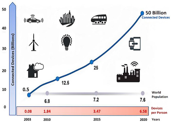 The technological advancements, especially in ICT, automation, and production, are increasing the number of internets connected devices. In the presence of these technologies, machines can communicate with each other as well as with the end products by using the IoT applications [39]. The factory devices from shop floors are continuously generating a massive volume of data [40]. The Cisco IBSG predicted that there would be 25 and 50 billion connected devices ranging from smartwatches, smartphones, ATMs, and PCs, to shipping containers and smart factories, by 2015 and 2020, respectively [41]. We represented the ratio of internet-connected devices over time, as shown in Figure 1. The data generated from these devices would be complex, scalable, and huge in volume. The data can be in the form of key-value sets or image/audio/video contents which are usually geo-stamped and time-stamped. So, this massive amount of data can be defined as Big Data and the IoT environment as a source of Big Data [42]. The major costly projects in the smart factory’s era are related to data acquisition, aggregation, and analysis; which contain the total cost of 21%, 17%, and 14%, respectively [20]. In modern days smart factories era, the data generated by industrial devices have reached to more than 1000 EB of total volume annually and will increase on regular bases [43,44].