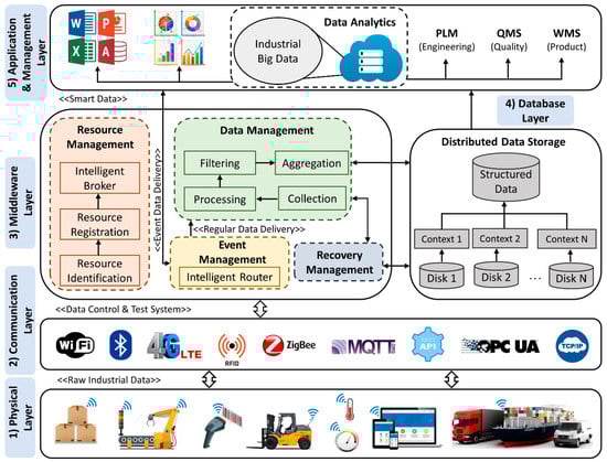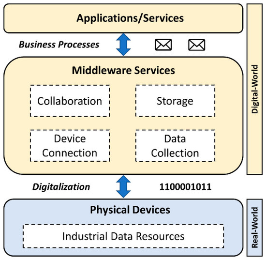 Industrial data is a very important resource that can be more critical for worldwide manufacturing business processes and the source of huge wealth if handled properly. Managing this data requires high processing and storage capabilities due to its huge, complex, and unstructured nature. The lifecycle of industrial data can be defined with the help of three phases like physical, middleware, and application as illustrated in Figure 2. The whole industrial environment has been divided into two sub-sections like the real and digital world. In real-world environments, the raw industrial data with various data types, formats, and diverse dimensions are generated by numerous physical components of smart factories. The physical devices component contains all valid data sources such as sensors, web-generated data, databases, and third-party applications. This component is also known as data discovery. After implementing the digitalization and aggregation processes this data becomes a part of the digital-world in binary form, where middleware and application components offer numerous services to manage it. The middleware component addresses interoperability across various factory devices, device discovery, scalability, management of massive data, context awareness, and the security features of the IoT environment [47].