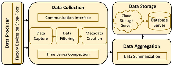 Data generated by factory devices are delivered to the data management component for pre-processing. We followed the data distribution system (DDS) technique for data management, proposed by Huacarpuma et al. [14]. The DDS can support multiple connections within IoT environment simultaneously. It comprises two main functions: data collection and aggregation. During the data collection function, data is acquired from devices at the physical layer and applied initial pre-processing steps. Furthermore, this data is sent to the aggregation component for summarizing into different chunks. Finally, the partially structured and aggregated data is sent to the distributed data storage module where it is converted into the fully structured format by applying context extraction techniques. Various modules of the data management component are shown in Figure 4 and further explained in the followings.