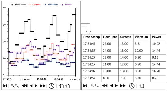 Figure 6 shows the data output from individual sensors of the smart pump. The data size calculation is depended upon the operations that proceed by reading sensors in every 10 seconds and transmitting the corresponding 120-byte message packets. This represents that the redundancy from the dataset has been removed, where each record associated with a unique observation of data chunk (i.e., every 10 second times stamp), and each attribute characterizes a unique measurement (i.e., liquid flow rate). This well-structured dataset offers consequent processing components with a more general format to perform the transformation. In this way, data acquisition and pre-processing efforts related to data analytics can be highly reduced.