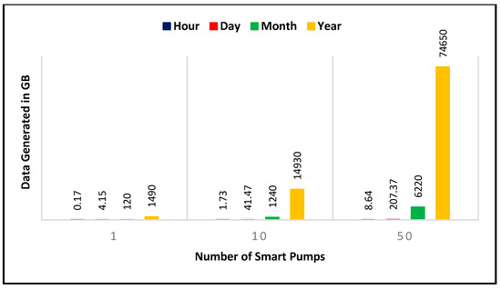 Figure 7 illustrates the volume of estimated generated data acquired by the IDMS framework for different numbers of pumps and for different time periods such as per-hour, per-day, per-week, and per-year. The process was done in increasing order of one to fifty pumps. The result shows that the generated data volume is proportional to the number of pumps being executed. Furthermore, data becomes huge when we measured it for a long-time duration. For example, data produced from 50 machines in an hour and during an entire year is 8.6 GB and 74,650 GB respectively. From these scenarios, it has been concluded that the proposed framework can be implemented in the vast industrial environment for the acquisition and storage of massive and heterogeneous data generated by factory devices.