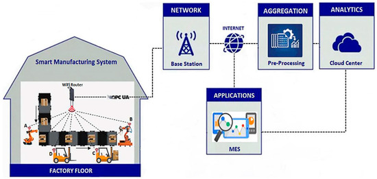 These days, manufacturers are relying on constant connections between industrial devices through the internet. So, Figure 8 shows that before final delivery on the production line, every product is deployed small size Wi-Fi enabled RFID tag by machine A, which provides exact status about the quality and location of every product to plant managers and assembly workers. Machine B receives the products and delivers them to machine C and D, which are responsible for the final delivery of products from the shop floor. Here every machine and product are communicating with each other and the monitoring system through a Wi-Fi router. The real-time data is efficiently collected using UPC-UA broker and after pre-processing, it is delivered to the cloud server for prognosis and predictivity analysis by MES. If there occur some abnormal or emergency events on the production line, such as any mechanical failure or some alarm, then the concerning threat is detected by event management module and directly delivered to top floor manager who is responsible to report back immediately and alert the floor technicians. In this way, manufacturers can easily access the line products data from anywhere and anytime. It will also help to keep the top floor management up-to-date by making sure the delivery of high-quality end products which were manufactured and distributed within time. For example, as the RFID tags are integrated with the PLCs of quality checking scale at the finishing point of the production line, high- and low-quality products results are directly transmitted to the MES level for the online monitoring of the production quality. This connection will also help the factory floor management to aware of the output of each production line, and to check whether they meet the production targets and whether the factory machines are working efficiently or not.