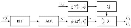 The threshold is determined typically based on two principles: constant false alarm rate (CFAR) and constant detection rate (CDR), which will be further explained in Section 2. In both cases, the noise variance (power) is generally supposed to be known to determine the threshold, as shown in [,]. However, noise variance may vary significantly in both temporal and spatial dimension due to the fact that the total noise is composed of thermal noise, receiver noise, and environmental noise. Generally, one may take the estimated noise variance, to some certain extent, as the noise variance in the calculation of the threshold in energy detection accordingly. The following two examples are given in [] for practical performance of energy detection. One example is that a certain channel is reserved for special applications by spectrum regulators. The special channel can only be used to estimate noise variance, and can never be used by a secondary user. For instance, channel 37 (from 608 to 614 MHz) in FCC is used in very few occasions but for radioastronomy. Another example is the detection of DTV pilot signals, in which the noise variance can be estimated from some frequency bin not corresponding to the pilot frequency under the low SNR scenario. In both examples, a threshold is computed from the estimated noise variance based on CFAR or CDR principles. Then, the threshold is used in the subsequent detection to determine whether a signal is present or not by comparing with the detected energy from the channel of interest or from the known pilot frequency bin.