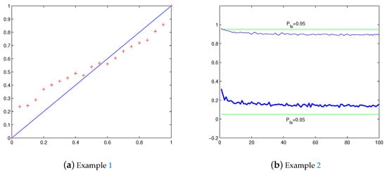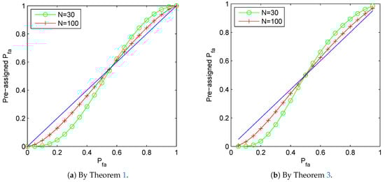 with , , and . Observe that , it follows that . Then by stated in Theorem 3, it is clear that the preassigned false alarm rate should be . It is plotted in Figure 5b how the cautious preassigned false alarm rate should be under the setting and , for the sequence . It is clearly shown in the figure that the preassigned false alarm rate should be much smaller than the value is designed to be. As the sample number N for estimation increases, the preassigned false alarm rate approaches to the value of .