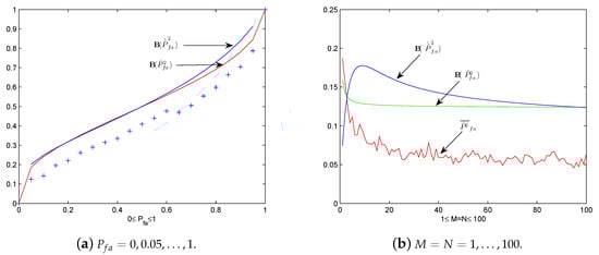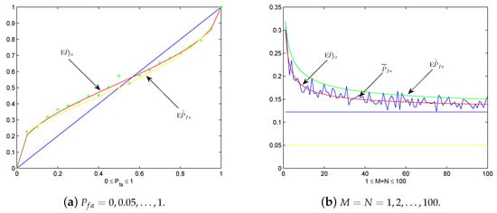 Plots of Examples 1 and 2. (a) Average false alarm probability vs. Pfa = 0, 0.05, …, 1. (b) vs. M = N = 1, 2, …, 100