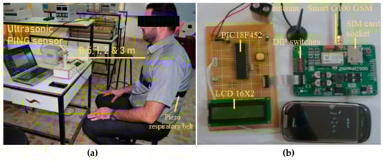 Investigation of the validity of the proposed system for monitoring breathing activity and abnormality was performed on 12 healthy subjects (10 males and 2 females) between the ages of 20 and 40. Meanwhile, a commercial Piezo respiratory belt transducer (MLT1132) was applied to the subject’s thorax to measure BR for validation purposes. The study adhered to the Declaration of Helsinki ethical principles (Finland 1964). The protocol was approved by local ethics committees (protocol number: 0000034901), and a written informed consent form for all subjects was obtained after a full explanation of the research procedures before commencing the experiment. The ultrasonic PING sensor (40 KHz) was placed in front of the subject’s thorax at different distances (0.5, 1, 2, and 3 m). The experiment was for approximately 60–120 s for each subject at a room temperature of 15 °C and repeated at different times of the day with different clothing to obtain sufficient signals. One subject was asked to simulate abnormal breathing syndromes by following a defined protocol consisting of 10 s normal breathing, 13 s of high rate breathing, 13 s breath holding, 38 s of low rate breathing, 20 s breath holding, and 18 s of irregular breathing followed by normal breathing. The experimental setup and the annotated photograph of the proposed system are presented in Figure 1.