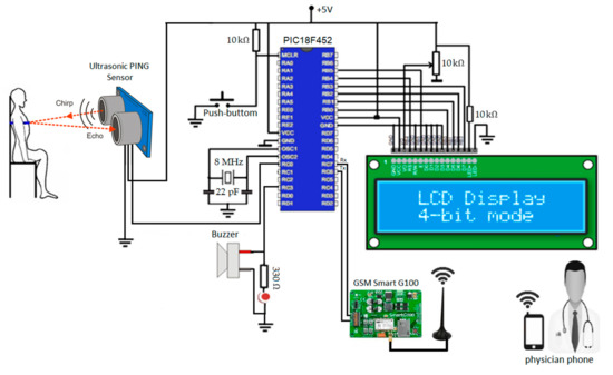 - The I/O port pins of the PIC18F452 were connected to the ultrasonic PING sensor, smart G100 GSM, buzzer alarm circuit and 16 × 2 liquid crystal display (LCD) as shown in Figure 2. The ultrasonic sensor was connected to the PIC microcontroller through the pin (RC0), where the PIC triggers the sensor with 100 μs pulse-width and then measures the amount of time elapsing until the arrival of the reflected signal measured by the same pin. The audible alarm circuit was connected to the output pin of the PIC (RC3) with a light emitting diode (LED) and a sound buzzer. The LCD display unit was connected to the output port of the PIC (PORT B) to display the subject’s name and their breathing state. The RXD/TXD (receive/transmit data) DIP pins of the smart G100 GSM modem was interfaced with the PIC via a serial protocol UART (RC6) as transmitting pin (Tx) and RC7 as receiving pin (Rx).