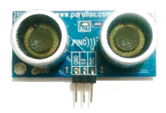 The ultrasonic PING sensor is a low-cost range sensor unit developed by Parallax Inc. (Rocklin, CA, USA) []. This sensor detects the reflection, or echo signal from an obstacle (subject’s thorax) and evaluates the propagation delay and amplitude of the return signal. This sensor provides accurate and remote distance measurements from 2 cm to 3 m with spatial resolution of 0.3 mm []. The physical shape of the ultrasonic PING sensor is shown in Figure 3.