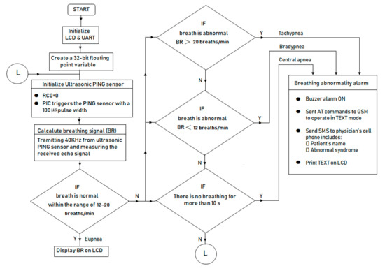 - The microcontroller reads the return signal and calcalutes the distance and breathing cycle using Equations (1) and (2). The microcontroller sends a text message alert to physician’s phone number when the BR falls outside the normal range (tachypnea for BR greater than 20 breaths/min and bradypnea for BR less than 12 breaths/min) [] or when no breathing exists for more than 10 s.