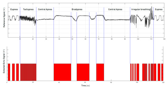 The main function of the respiratory system is to exchange gases between the blood and air through the respiratory process (inhalation and exhalation). The anatomical structure of the respiratory system includes airways, lungs, and the respiratory muscles that are all located in the thoracic region. The main muscle that causes the inhalation and exhalation movement, is called the diaphragm. As a result of movement of the diaphragm muscle, the thorax moves from 4 mm to 12 mm with a different frequency band between 0.1 Hz and 0.3 Hz []. The rate of this movement can be noted by observing the rhythms of breathing. The number of breaths per minute is called the breathing rate (BR). The range of the BR varies with age, weight, exercise tolerance, and body conditions, but the normal range at rest is between 12–20 breaths/min for adults []. During normal breathing, the BR is sometimes called eupnea while breathing abnormality occurs when BR falls outside the normal range and it can be classified into several events; tachypnea (a medical condition that occurs when BR exceeds the normal range), bradypnea (a medical condition occurs when BR is lower than the normal range), and central apnea (a medical condition occurs when there is no breathing for more than 10 s) [,].