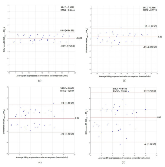 Secondly, the degree of agreement, correlation coefficient (Spearman’s rank correlation coefficient SRCC), and error ratio (root mean square error RMSE) for BR measurements from 12 subjects with normally clothed, measured by the proposed monitoring system described above and those extracted by a reference system (PowerLab data acquisition software), was determined by Bland-Altman analysis []. Based on Bland-Altman analysis, the degree of agreement can be observed by calculating the standard deviation (SD) of the differences between measurements obtained by the reference system and proposed monitoring system and determining a confidence interval (±1.96 SD) within 95% of the differences between measurements, which is estimated by the mean difference. The differences between measurements obtained by the reference system and the proposed monitoring system were plotted against the averages of both systems at different distances (0.5, 1, 2, and 3 m) as shown in Figure 6.