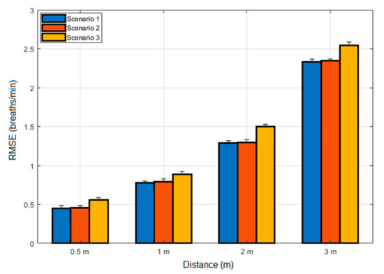 To test the effect of clothing on the measurements at different distances, the measurements were carried out for one subject under different clothing scenarios. The first scenario was when the thorax region was nude. The second scenario was for a subject wearing only a shirt. The third scenario was for a subject wearing a shirt, sweater and jacket. The relationship between the RMSE values and the distances for different clothing insulation is shown in Figure 7. It can be seen that the RMSE values between the BR measurements obtained by the reference system and proposed monitoring system for the first and second scenarios were approximately the same and slightly increased when the third scenario applied. In addition, it can be seen from Figure 7 that as the distance increases, the RMSE values for all scenarios are increased due to free space loss.