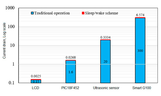 The improvement of current drain in the LCD, microcontroller PIC18F452, ultrasonic sensor, and smart G100 GSM modem based on the sleep/wake scheme is shown in Figure 8.