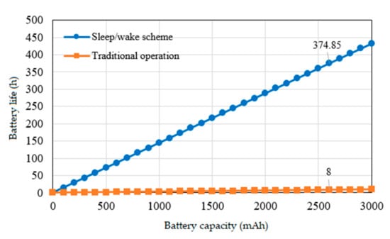 The estimated battery lifespan for various battery capacities for the sleep/wake scheme and traditional operation is shown in Figure 9. This figure reveals a considerable development of battery lifespan of the proposed monitoring system when the sleep/wake scheme was used instead of the traditional operation. The battery life time of the proposed monitoring system using Equation (6) could be extended to 374.855 h instead of 8 h when the traditional operation was used instead.