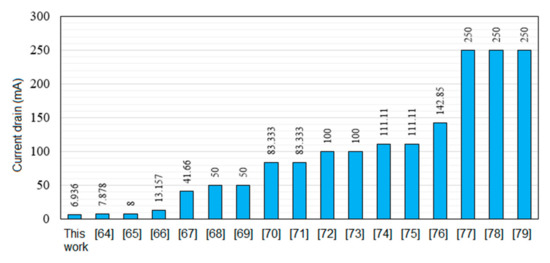 We also compared the power consumption of the proposed monitoring system based on the sleep/wake scheme to the sixteen existing studies that employed different non-contact technologies such as GSM modem, ZigBee, and Bluetooth to communicate the vital signs of the patients [,,,,,,,,,,,,,,,]. The power consumption of different medical applications dissimilar to the breathing syndromes was considered for comparison because there are no previous studies similar to the current work focused on energy consumption. Our proposed monitoring system based on the sleep/wake scheme outperformed these studies and it had the lowest current consumption of 6.936 mA as demonstrated in Figure 10.