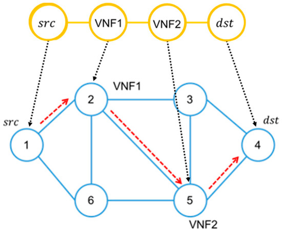 The SFC deployment problem is to decide about where to deploy VNFs and how to route data traffic through the VNFs in the substrate network, so that the computing resources such as CPU and memory, and network resources such as link bandwidth and buffer capacity, are efficiently utilized and the service requirements are met. Figure 1 shows an example of an SFC deployment problem. The upper graph is an SFC composed of two VNFs between source node and destination node, and the bottom graph is a substrate network with six substrate nodes on which the SFC can be deployed.