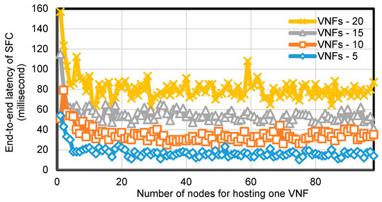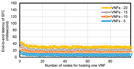For each specific number of VNFs in the SFC, we evaluated our scheme by varying . The results shown in Figure 4 and Figure 5 indicate that as increased, the end-to-end latency of the SFC decreased, when was at low value, but finally stopped decreasing and remained stable even when increased. This is because at a low value of only a few nodes can be selected for SFC routing and these nodes may be scattered in the network, thus resulting in a longer end-to-end latency for SFC.