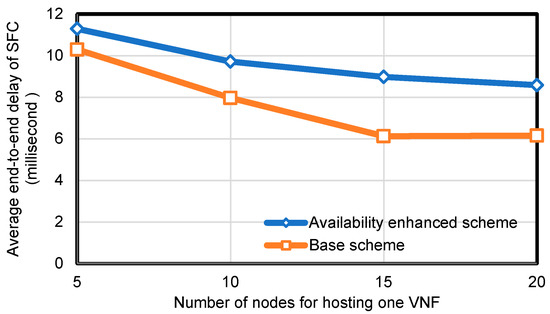 Figure 6 shows the average end-to-end latency of the SFC in the substrate network. The experiments were conducted on the substrate network in which the number of nodes of the network was fixed at 100 and the edge connection probability was fixed at 0.5. Each SFC request contained five VNFs. We varied as 5, 10, 15, and 20, and repeated the experiment at each value 1000 times. The results show that the average of end-to-end latency of SFC was 11.287 when using the availability-enhanced placement scheme, and 10.292 when using the base scheme. As the number of nodes for hosting one VNF increased, the availability-enhanced placement scheme achieved a bit higher latency compared with the base scheme. This is reasonable since our scheme avoids multiple VNFs being deployed on the same node, which may occasionally result in a longer path from the source to destination nodes.