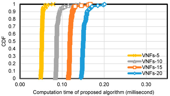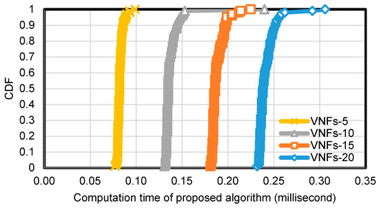 To evaluate the performance of Algorithm 1 in terms of computation time, we set the number of nodes in the substrate network topology as 50 and 100, and the edge connection probability was fixed at 0.5. We also fixed at 5 and varied the number of VNFs in an SFC as 5, 10, 15, and 20. We repeated the experiment with each configuration 100 times and collected computation time cost for running Algorithm 1. Figure 7 and Figure 8 show the cumulative distribution function (CDF) of computation time cost of Algorithm 1.