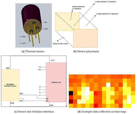 The sensor is interfaced with an Arduino Uno for data collection (schematic diagram in Figure 1c), which is connected to the PC via USB. The hardware setup uses a sequential approach, i.e., the data from the sensor are collected by the Arduino Uno before they are transferred to the PC. Thermal sensors have a field of view of 125 × 25 (125 degree horizontal and 25 degree vertical view). These sensors follow I2C communication protocol, i.e., the data are transmitted bit-wise to the Arduino device. In our setup, the thermal sensor acts as a master, sending the clock signal to the slave device (Arduino) before it starts transmitting the data over the SDA line. The data are divided into messages and each message is divided into frames (including start/stop bits, address frame, read/write bit, 8-bit data, and ACK/NACK bit).