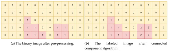 To show how the algorithm works visually, we present an example in Figure 3. In Figure 3a, we can see two values of 0 and 1. The ideal semantics is that if the pixel value is “1” then a person is present, else no one is present. For this algorithm, we use eight-way connectivity. The algorithm starts iterating over each pixel in Figure 3a. It checks the first-pixel value, which is “0”, and gives it a label “0” as in Figure 3b. Next, the algorithm iterates and checks the second pixel, which also has a value of “0”. However, before assigning it any label, it verifies whether any of the diagonals, top, bottom, left and right pixel have a value of “0” and whether any of these pixels are labeled previously. In this example case, the left pixel has the same value and has already been labeled. Thus, in this scenario, we can say that first and second pixels are connected and grouped and, hence, assign a label of “0” to the second pixel. Similarly, it checks for all other pixel values. When the algorithm reaches the third row and fourth column, it observes that the pixel value is “1’,’ which is different from the other labeled pixels. Now, by using eight-way connectivity, it checks whether the surrounding pixel values have the same intensities. The third row, fourth column pixel has the same value in the pixel below it but the bottom pixel has not been labeled yet. Thus, the third row, fourth column pixel gets a label of “1”, as shown in Figure 3b.
