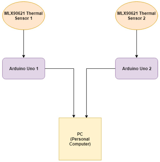 Our system setup uses the same low-resolution thermals sensor as before (4 × 16 MLX90621 thermal sensor [49]), with two changes: (1) the placement of the thermal sensors; and (2) instead of one sensor, we use two of them to increase field of view (FoV). The thermal sensors use the I2C communication protocol to transfer the sensed data to two separate Arduino Unos. The block diagram in Figure 4 shows the sequential process in which the data are collected by two sensors and transferred to two Arduino Unos, respectively. The data from both the sensors are appended and saved on a PC.