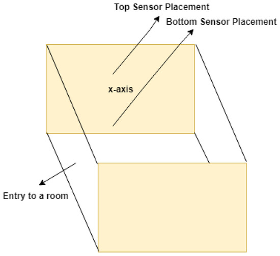 The pictorial representation of the hardware setup in the smart space is shown in Figure 5. In this figure, we can observe that two sensors are placed one beneath the other in our smart room setup, with dimensions 2.5-m × 2.75-m. The two sensors are placed on the x-axis of the 3D environment to increase the field of view (FoV) vertically. This is crucial to get more data points to accurately capture the activities.