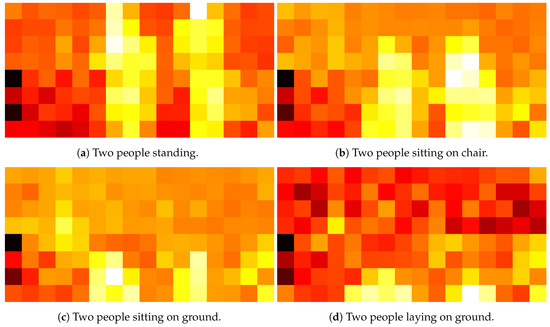 We collected data using two MLX90621 thermal sensors. The thermal data were then transmitted to two separate Arduinos. A Python script, based on multiprocessing, captured the data and stored them in the form of heat maps (as in previous section) and CSV file on the PC. The two sensors were placed on the x-axis one below the other so that they could be appended vertically to increase the field of view (FoV) from 4 × 16 to 8 × 16. This means that now for a single reading across a row, the combination of two sensors will return 128 temperature values (in °C). Example heat maps corresponding to different activities are shown in Figure 6.