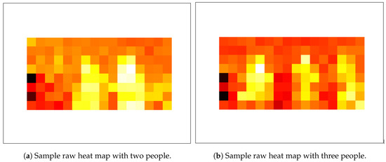 Meanwhile, the data were saved as a heat map as well as logged in as a CSV file. The CSV file had two columns, one for the timestamp and the other for 128 (8 × 16) temperature values. The temperature was high in regions where a human presence was detected. The data captured by two thermal sensors at a particular instance of time were represented either by a single heat map image or a single row for a CSV file.
