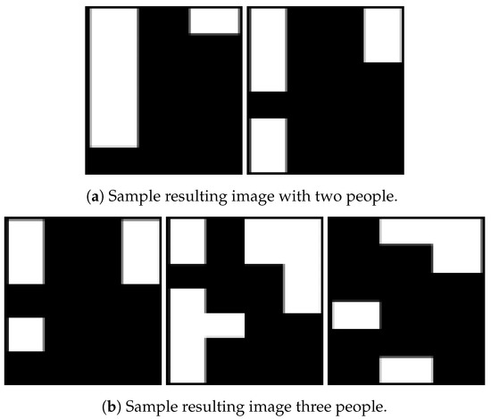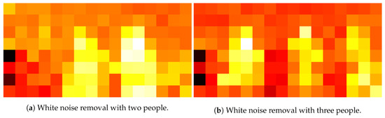 The data collected from two MLX90621 sensors were saved as raw data on the PC. The raw data mean the primary data that were obtained from the source. Our eventual task was to detect the activities of different people in our smart space. However, we cannot predict the activities using directly primary data as there will be external or internal noise present in them. We need to pre-process the data before giving them to any prediction algorithm so that we can remove unwanted noise from the dataset. If we do not perform this task on the primary dataset, then there might be an ambiguity in the results which would decrease the overall model performance. The steps we took to pre-process the raw heat map images include: white noise removal, background subtraction, extracting multiple regions of interest (RoI), separating each RoI, resizing each RoI, and finally converting the image to pixel values. Next, we go over each step in detail, using the two sample images in Figure 7, one with two people (Figure 7a) and the other with three people (Figure 7b).