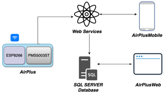 The system architecture includes an acquisition module for data collection and data transmission. AirPlus incorporates web and mobile compatibility for data consulting and notifications. The monitored data is stored in a Microsoft SQL Server database while using web services. For data consulting a web portal named AirPlusWeb and a mobile application for iOS named AirPlusMobile have been developed using ASP.NET and Swift, respectively (Figure 1).
