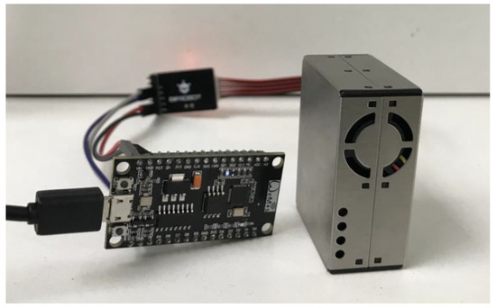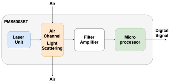 The PMS5003ST (Beijing Plantower Co., Ltd, Beijing, China) is a multifunction sensor that can measure the concentration of particles and formaldehyde, as well as temperature and humidity levels. This sensor can be used to provide particle concentration levels by calculating the number of suspended particles in the air using the laser scattering principle. Moreover, this sensor module incorporates an electrochemical probe for formaldehyde detection and a built-in sensor unit for temperature and humidity. This sensor uses a laser unit to generate scattering to radiate the suspending particles in the air (Figure 3).