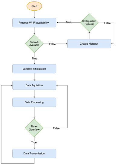 On start, the acquisition module handles the Wi-Fi availability. If one saved network is available, the system tries to connect to that network. In the case that there are no networks available for connecting, the system turns into a hotspot and wait for new Wi-Fi SSID and password data. After variable initialization, the system handles the data acquisition from the sensor and the data is then processed. If the defined timer is overflowed, the system sends the data to the remote database.