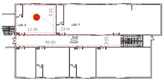 Figure 7 shows the indoor mapping of the room. The acquisition module was positioned on the centre of the room and the router was positioned in the corridor at a distance of about 13 m. The monitored space is naturally ventilated without any dedicated ventilation slots on the facades. Natural ventilation is performed through uncontrolled air infiltration, with just doors and windows opening. The room is typically occupied by an average of 15 people on working days from 9 a.m. to 6 p.m. The proposed solution is powered by a 230V-5V AC-DC 2A power supply.