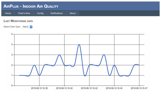 The AirPlusWeb has been developed to be an indoor quality integrated management system. This web solution incorporates several features for data analysis and visualization in numerical and chart representation. First, the proposed software allows for the building manager to call the occupants to consult the last collected data in real-time. Second, this web platform provides a chart representation of the data that were collected which can be used to detect IEQ patterns. The AirPlusWeb provides a notification history for data consulting. The chart representation seems to be efficient when compared to the numeric platform, because the end user can detect high IEQ variations and test the effectiveness of the interventions easily. Figure 8 shows the PM monitored data from the tests. This chart representation allows for quick access and assessment of the IEQ, as the user can check the data in real-time anywhere, anytime. Furthermore, the end user can easily select the specific parameter wanted and analyse it by using a dropdown list menu.