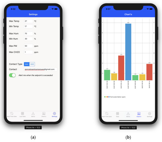 Smartphone usage in the western world has significantly increased. At present, smartphones incorporate a tool kit of features regarding not only the connectivity technologies available, but also relevant processing power and data visualization capabilities. Smartphones incorporate indispensable daily routine functionalities and provide a significant variety of applications, such as data consulting, communication, education, scheduling, and entertainment applications. Furthermore, most smartphones use touch screens. They provide Internet access throughout several communications technologies, such as Wi-Fi and cellular networks. They enable other features, such as GPS navigation and media players; they incorporate powerful cameras [69]. The communications regulator Ofcom states that 93% of United Kingdom population use smartphones and the users typically spend more time while using the smartphone with Internet when compared with other gadgets, such as personal computers. This indicates that people are closely intertwined to smartphones that enable Internet access anytime, anywhere, and for several proposes [70]. Mobile computing enables the pervasive connectivity of the Internet through smartphones. It stimulates considerable changes in a daily routine, because people have developed skills and behaviours, such as social networks and home remote control [71]. Taking into account all of the reasons described above, a smartphone application has been proposed to enable the user to carry their IEQ data in his pocket for every moment use. This mobile computing software provides several features for data consulting and analytics, but also for configuration. The user can access the mobile application, in order to: check the last collected data, check the history of the indoor parameters, and configure the setpoints for notifications. Figure 9a presents the settings feature of the mobile application. This feature provides a useful and easy notification setpoint configuration to receive alerts in real-time to enable quick interventions for enhanced living environments. This functionality provides a personal configuration of the IEQ according to the user needs and space requirements. Figure 9b shows the chart view functionality that was incorporated in the mobile app. This functionality provides enhanced visualization feature to provide a quick analysis of the IEQ. Furthermore, Figure 9b shows the average PM levels by day. The user can analyse the variation of PM levels throughout the week. Figure 9b shows that there is a day in which the PM levels are much more deficient than the others. Then the building manager can assess the activities that led to this poor air quality result to plan interventions to improve indoor conditions.