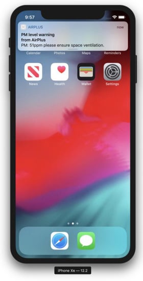 Moreover, the system has a significant feature regarding the notification architecture. The data collection uses an acquisition module; the data is sent to a remote database for data storage while using web services. In the middleware, the system incorporates data processing features for notifications. The collected data are validated and analysed before being inserted into the database; it takes into account the defined setpoints. These setpoints are predefined while using well-studied health values that were collected from the literature, but they can be updated while using the web platform or the mobile application. If the collected data exceeds the defined thresholds, the user receives a notification in real-time. Figure 10 shows the notification alert output on the smartphone display. It is a PM notification of 51 ppm. This notification displays the parameter that triggers the alert and a message to advise the user to take action in useful time to improve IEQ while using space ventilation. These alerts are sent in real-time. They are trustful, efficient, and effective in ensuring good IEQ levels for enhanced living environments.